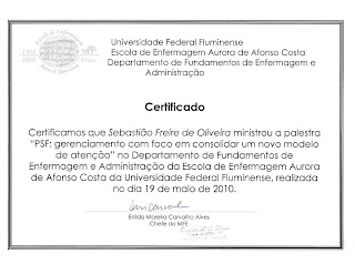 No dia, 19/05 o enfermeiro Sebástian Freire, do PSF Santa Marta, proferiu palestra sobre “PSF: gerenciamento com foco em consolidar um novo modelo de atenção” para os alunos do 6 período da faculdade de Enfermagem da UFF. A equipe do ESF Santa Santa agradecer o convite da Dra. Marilda Andrade e se coloca a inteira disposição.