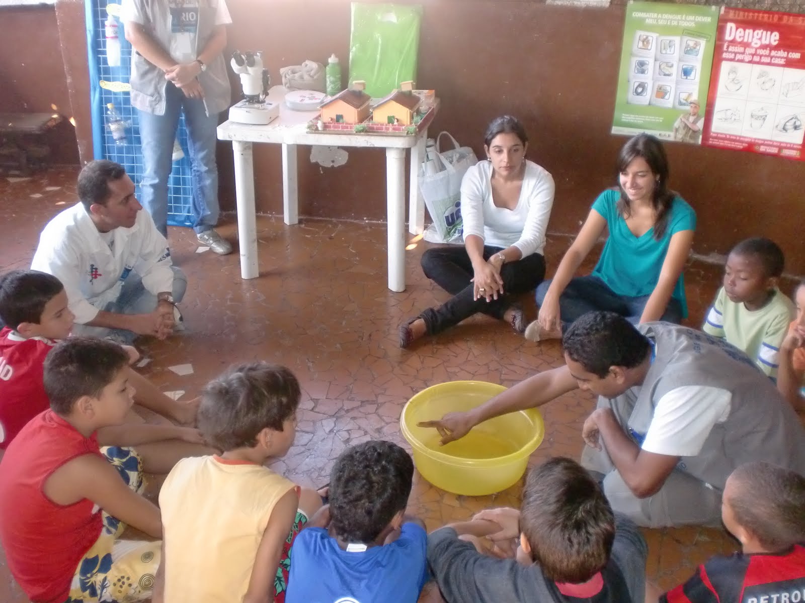 Os profissionais da Vigilância Epidemiológica da CAP 2.1 disponibilizaram material educativo, dentre eles o que fez mais sucesso foi o microscópio, onde as crianças podiam ver o ovo do mosquito e acompanhar todo o seu ciclo evolutivo.